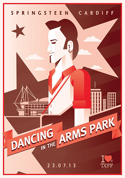 We were lucky enough to snaffle a couple of Gold Circle wristbands by getting in early. As you can see (above), we got near the front and did our best to ensure that Bruce saw our Jon Stick-designed Dancing In The Arms Park poster.