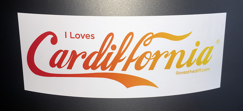 We offer both vinyl and window/car stickers – the finishing touch to any decent Cardiff motor, we reckon. Both 'normal' (vinyl stickers that can be applied to almost any flat surface) and car stickers (with reverse print for going on glass) are 10cm square and come with either a red or blue heart on a white background. Also available is a Cardiffornia sticker – see below. Photo above taken at Cardiff International White Water in Cardiff Bay by Nikki P (@NikkiJ51 on Twitter) |